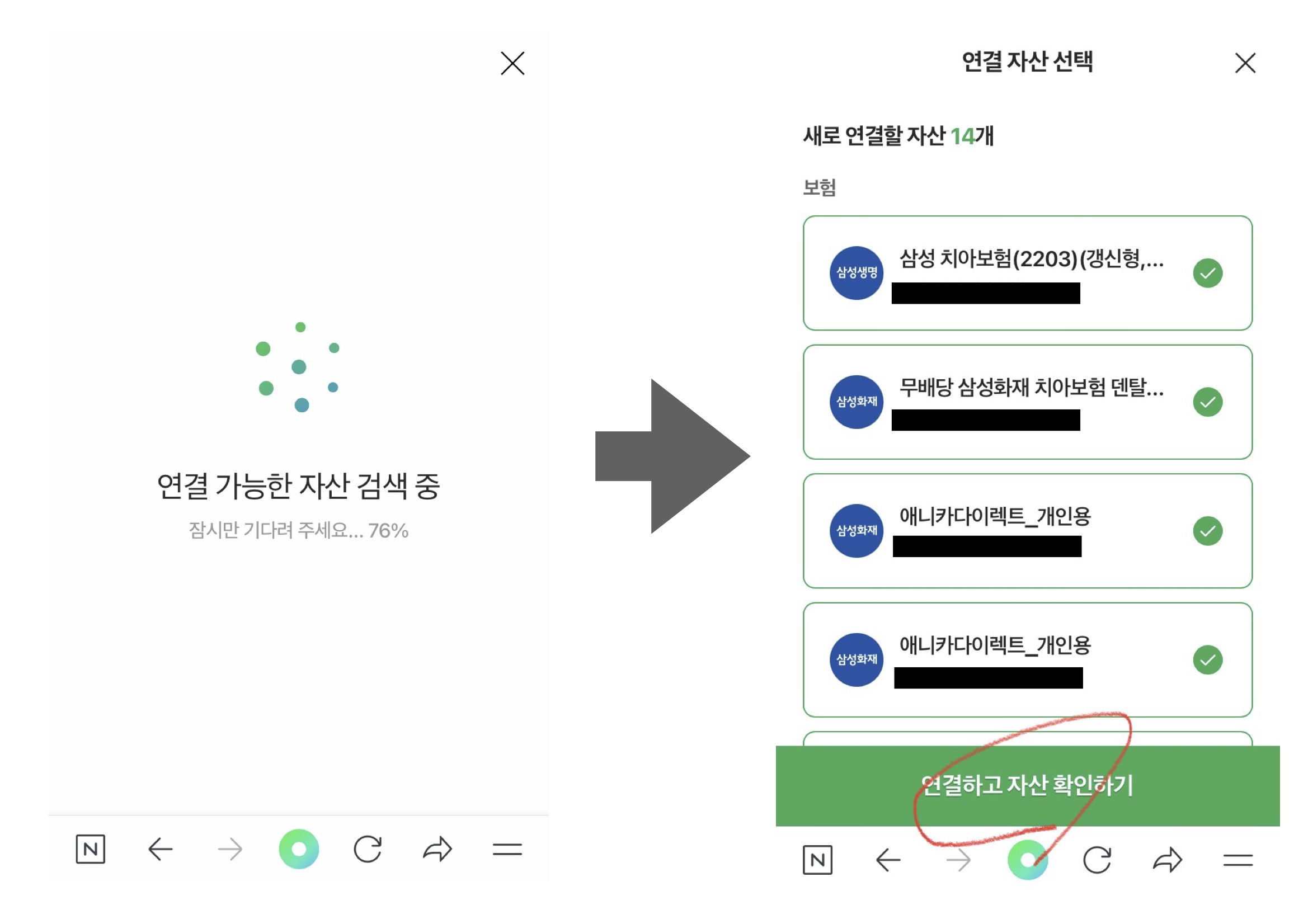 이제 조금만 기다리시면 자신이 가입되어 있는 보험을 모두 찾게 됩니다. 이후 화면 하단 '연결하고 자산 확인하기'를 클릭합니다.