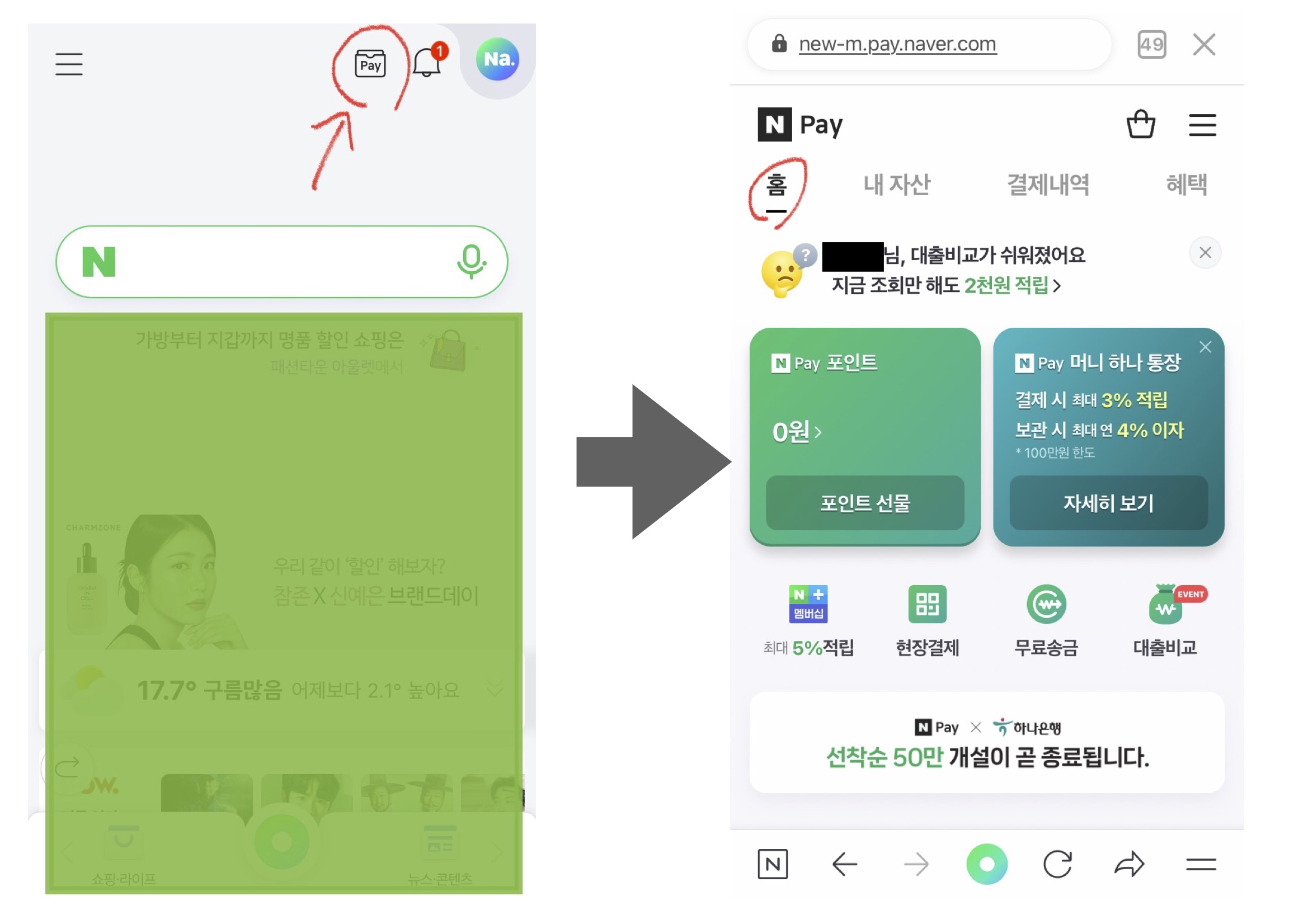네이버 앱에 들어가셔서 첫화면 상단 '네이버페이(Pay)' 아이콘을 클릭합니다.