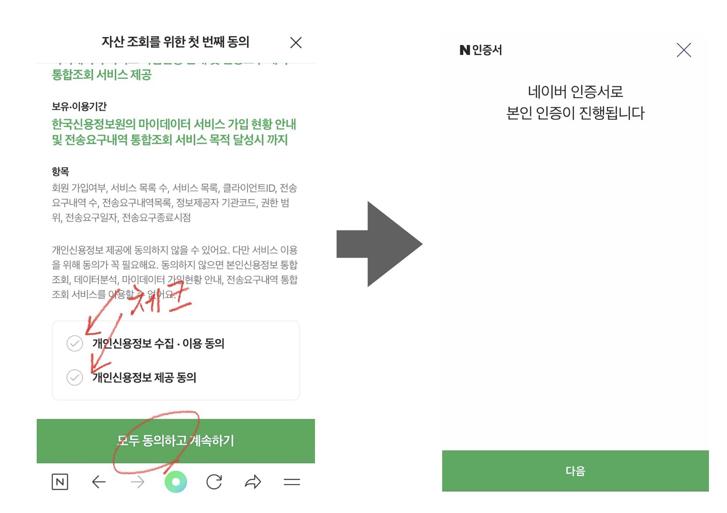 다음 개인신용정보 수집과 이용 동의, 개인신용정보 제공 동의 모두를 체크하셔야 합니다. 그 다음 화면 하단에 '모두 동의하고 계속하기'를 클릭합니다.