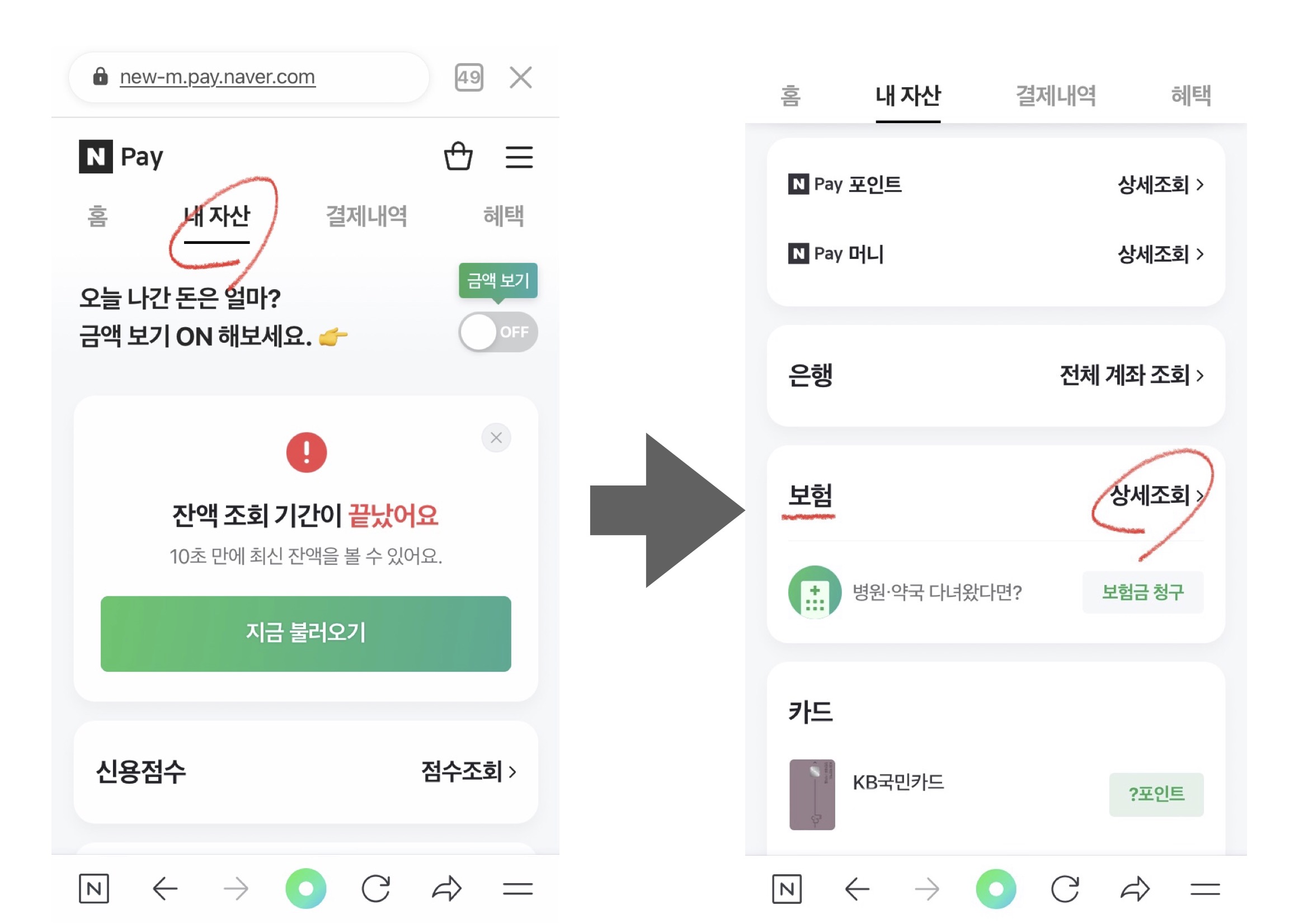 네이버페이 첫 화면에서 '내 자산'을 클릭해주세요.