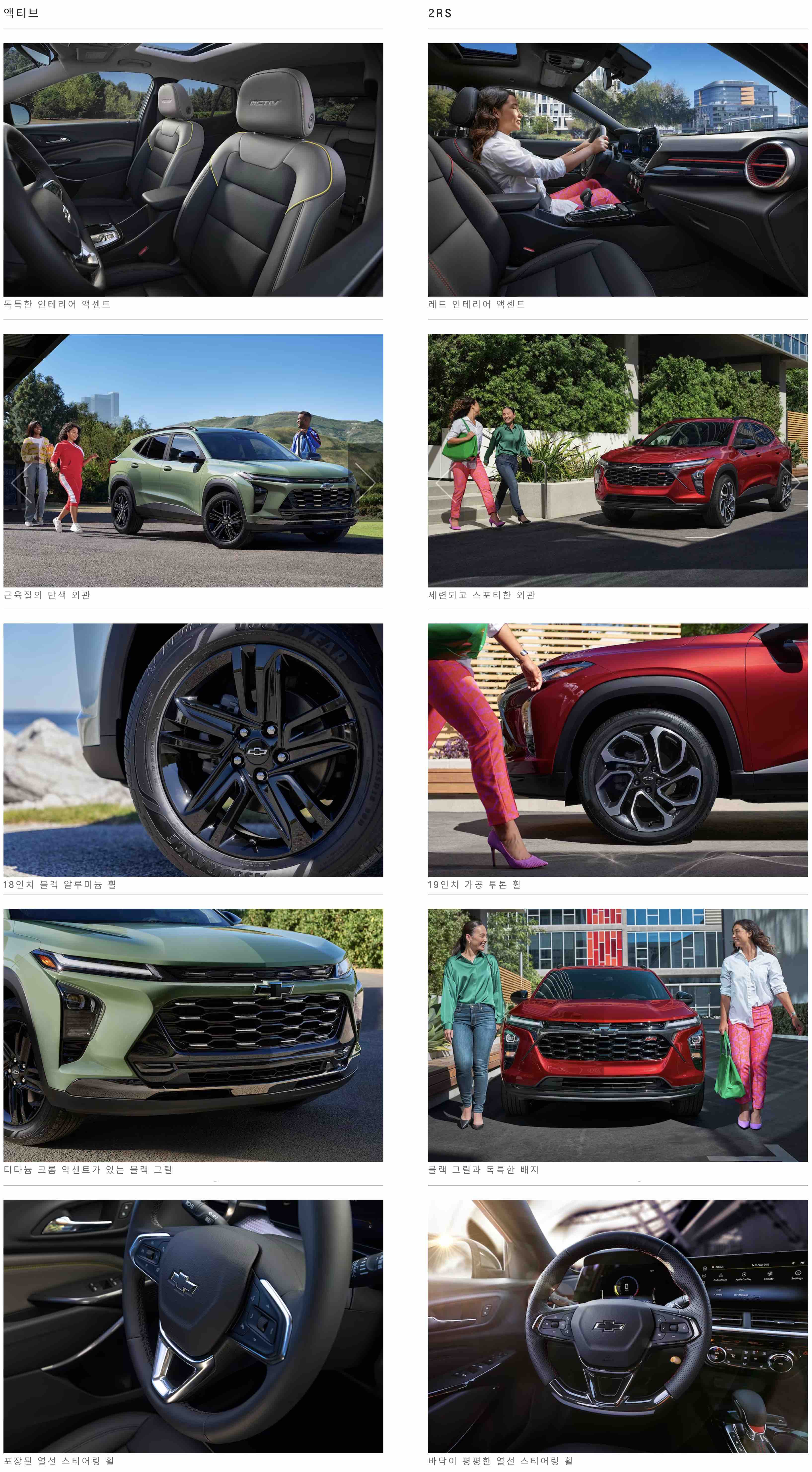소식에 의하면 신형 '트랙스 크로스오버' 국내 모델은 북미 모델과 디자인, 성능은 동일하며 일부 사양만 국내 규정 및 기준으로 맞추어 출시한다고 합니다. 이러기에 수출용 차량을 참고 하시면 많은 도움이 되시리라 생각됩니다. 더 나아가 이전 모델보다 많은 기능이 추가되었고 모델마다 다른 디자인으로 출시되니 자세히 보시고 사전예약하시길 바랍니다.