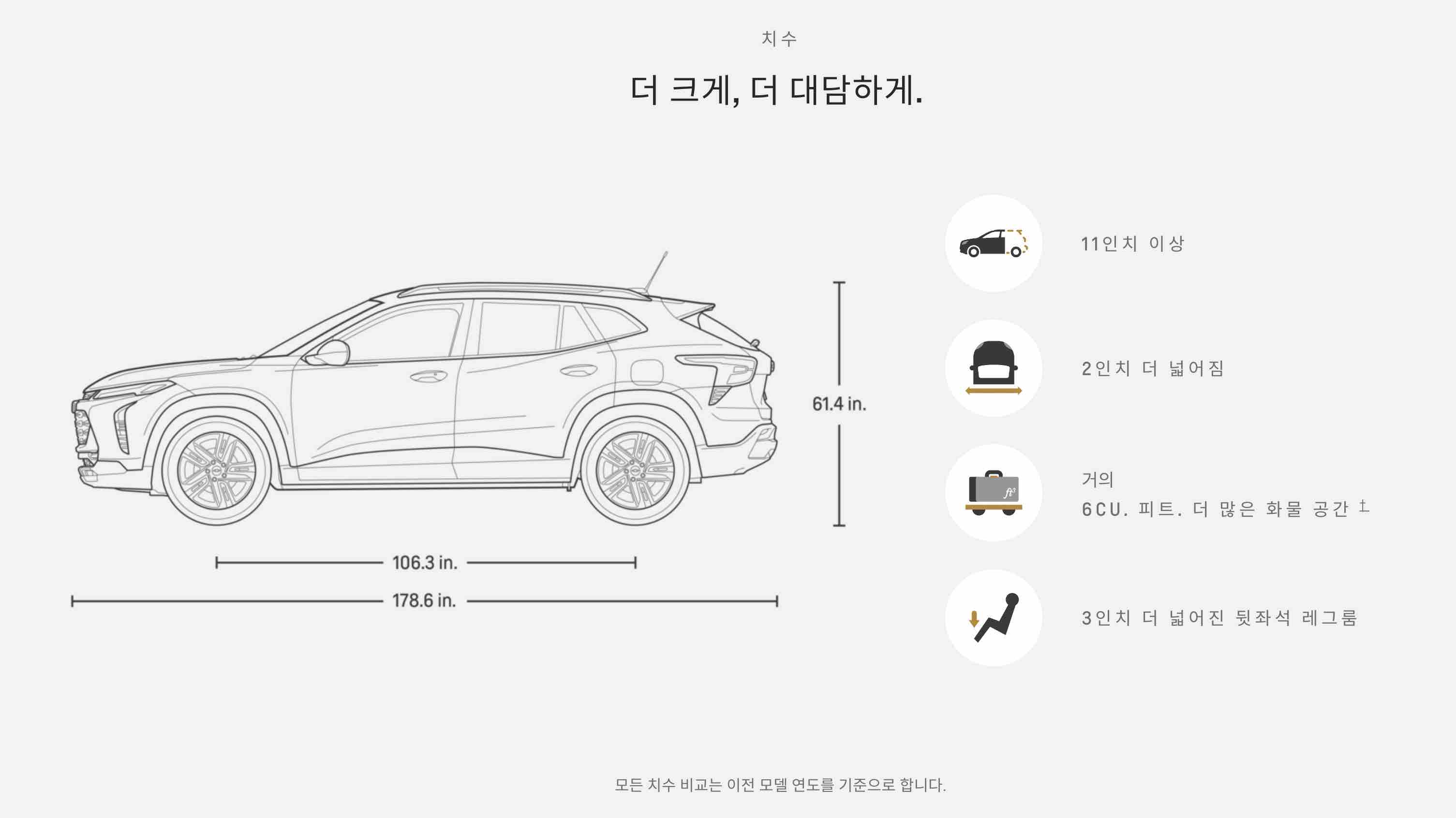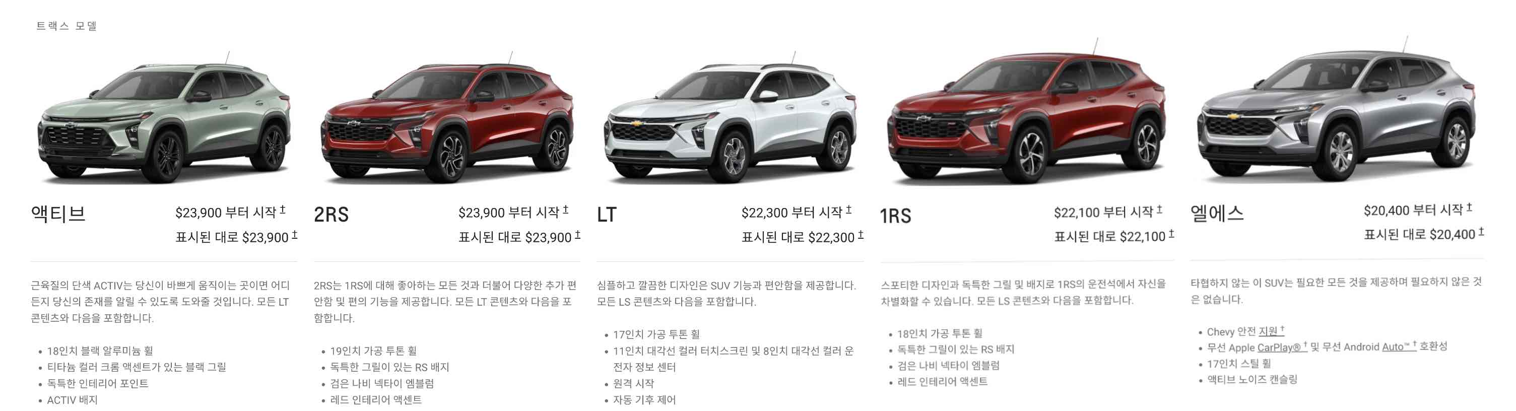 소식에 의하면 신형 '트랙스 크로스오버' 국내 모델은 북미 모델과 디자인, 성능은 동일하며 일부 사양만 국내 규정 및 기준으로 맞추어 출시한다고 합니다. 이러기에 수출용 차량을 참고 하시면 많은 도움이 되시리라 생각됩니다. 더 나아가 이전 모델보다 많은 기능이 추가되었고 모델마다 다른 디자인으로 출시되니 자세히 보시고 사전예약하시길 바랍니다.
