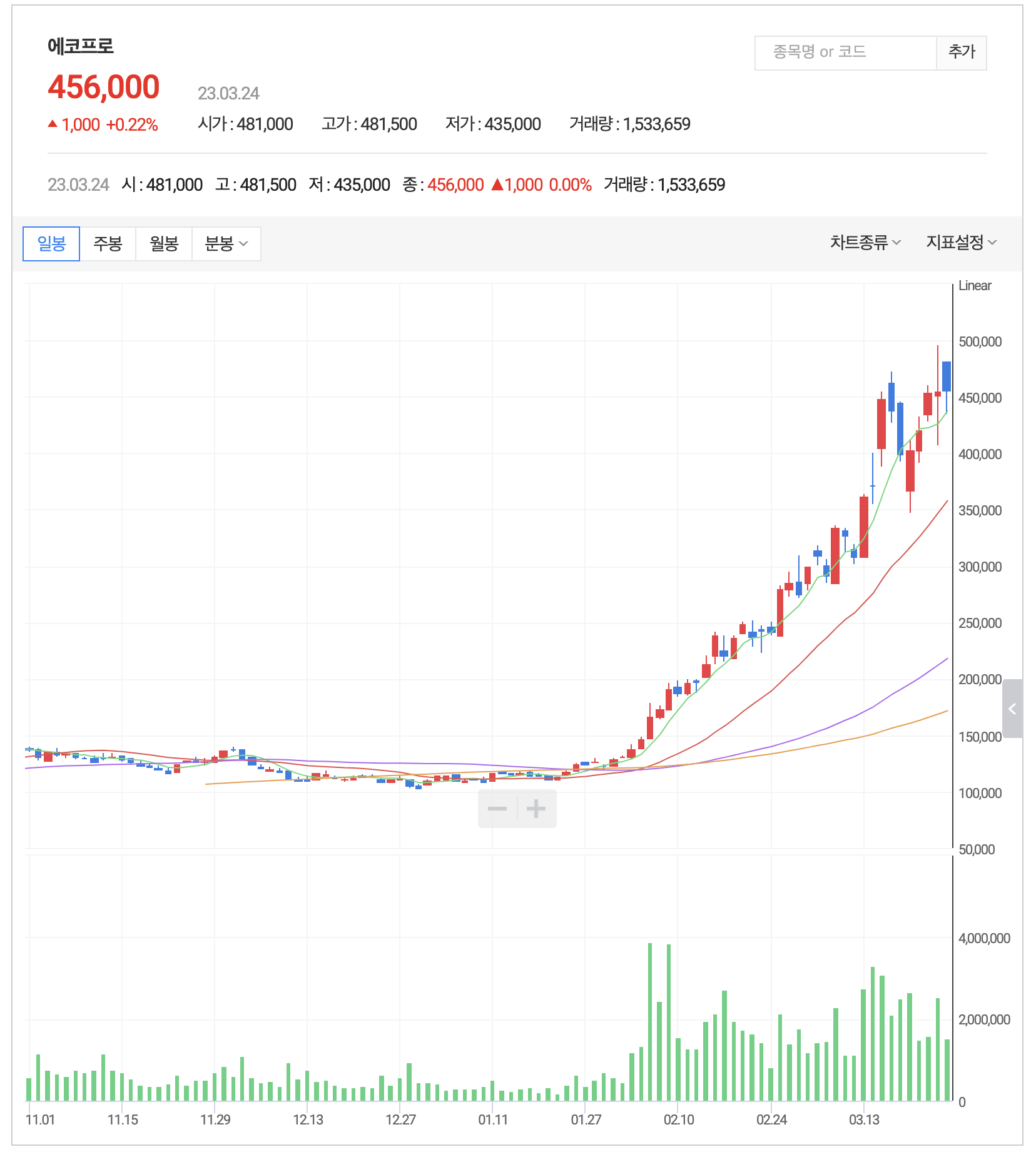 이번주 2차 전지주가 최근들어 국내 증시의 주도 주로 떠올랐습니다. 그 가운데 에코프로 3형제가 기록적 상승을 보이고 있으며 한국의 밈 주식으로 등극하게 되었습니다. 지주사 에코프로와 양극재 제조 부문을 분할한 에코프로비엠의 주가는 전 거래일 대비 10% 오른 23만원 중반으로 역대 최고가를 경신했고 환경 사업을 분할한 에코프로에이치엔도 이날 장중 상한가를 기록해 23% 이상 오른 8만중반에 거래를 마쳤습니다. 지주사의 경우 장중 전 거래일 대비 9% 이상 올랐으나 0.44% 상승한 45만5000원에 마감했습니다. 역시나 사상 최고가 기록을 계속 갈아치우고 있습니다. 이 3사 주식의 평균 상승률은 200%에 달하고 있으며 모두 개인 투자자들이 사들여서 만든 기록으로 보입니다.