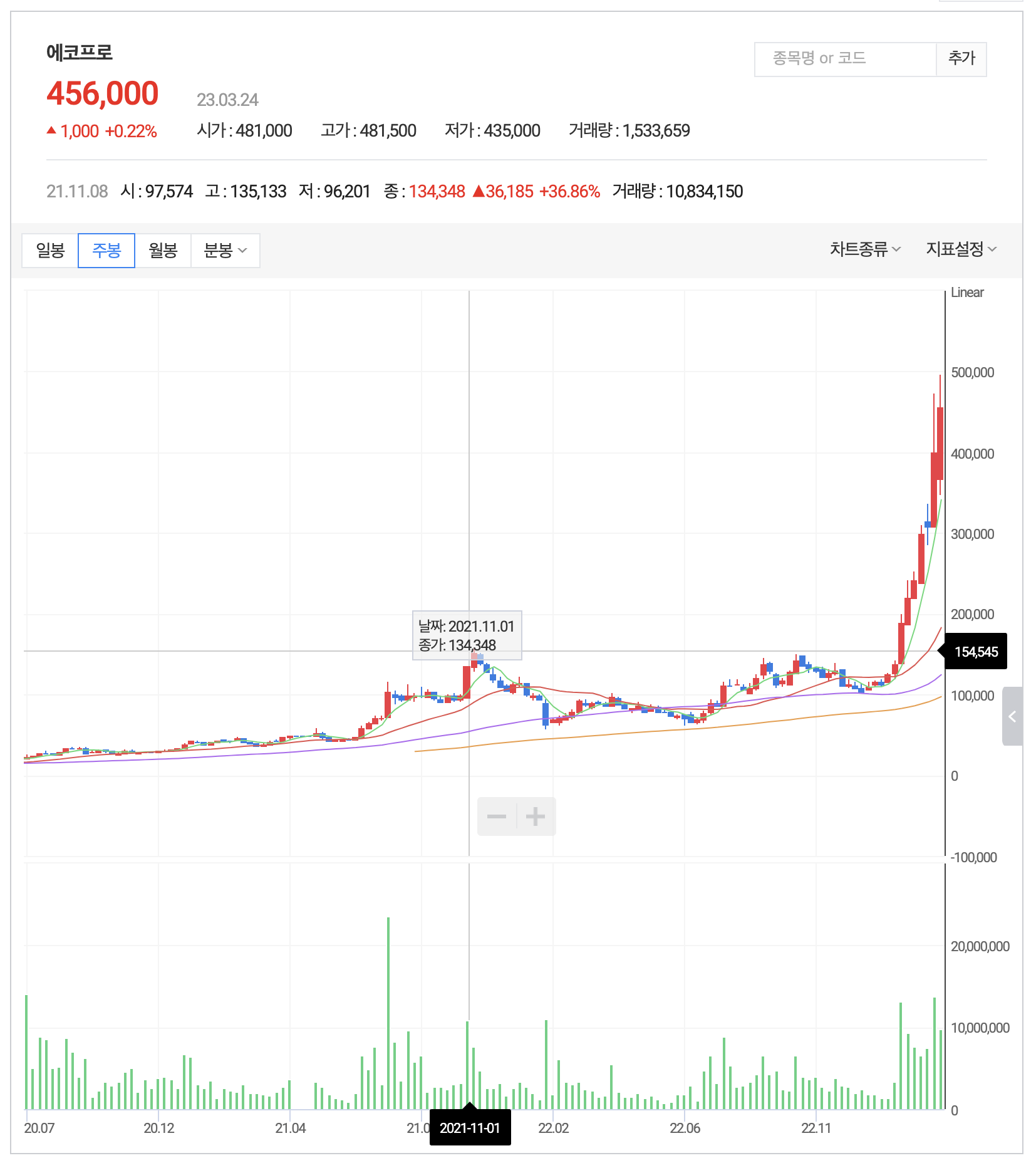 이번주 2차 전지주가 최근들어 국내 증시의 주도 주로 떠올랐습니다. 그 가운데 에코프로 3형제가 기록적 상승을 보이고 있으며 한국의 밈 주식으로 등극하게 되었습니다. 지주사 에코프로와 양극재 제조 부문을 분할한 에코프로비엠의 주가는 전 거래일 대비 10% 오른 23만원 중반으로 역대 최고가를 경신했고 환경 사업을 분할한 에코프로에이치엔도 이날 장중 상한가를 기록해 23% 이상 오른 8만중반에 거래를 마쳤습니다. 지주사의 경우 장중 전 거래일 대비 9% 이상 올랐으나 0.44% 상승한 45만5000원에 마감했습니다. 역시나 사상 최고가 기록을 계속 갈아치우고 있습니다. 이 3사 주식의 평균 상승률은 200%에 달하고 있으며 모두 개인 투자자들이 사들여서 만든 기록으로 보입니다.
