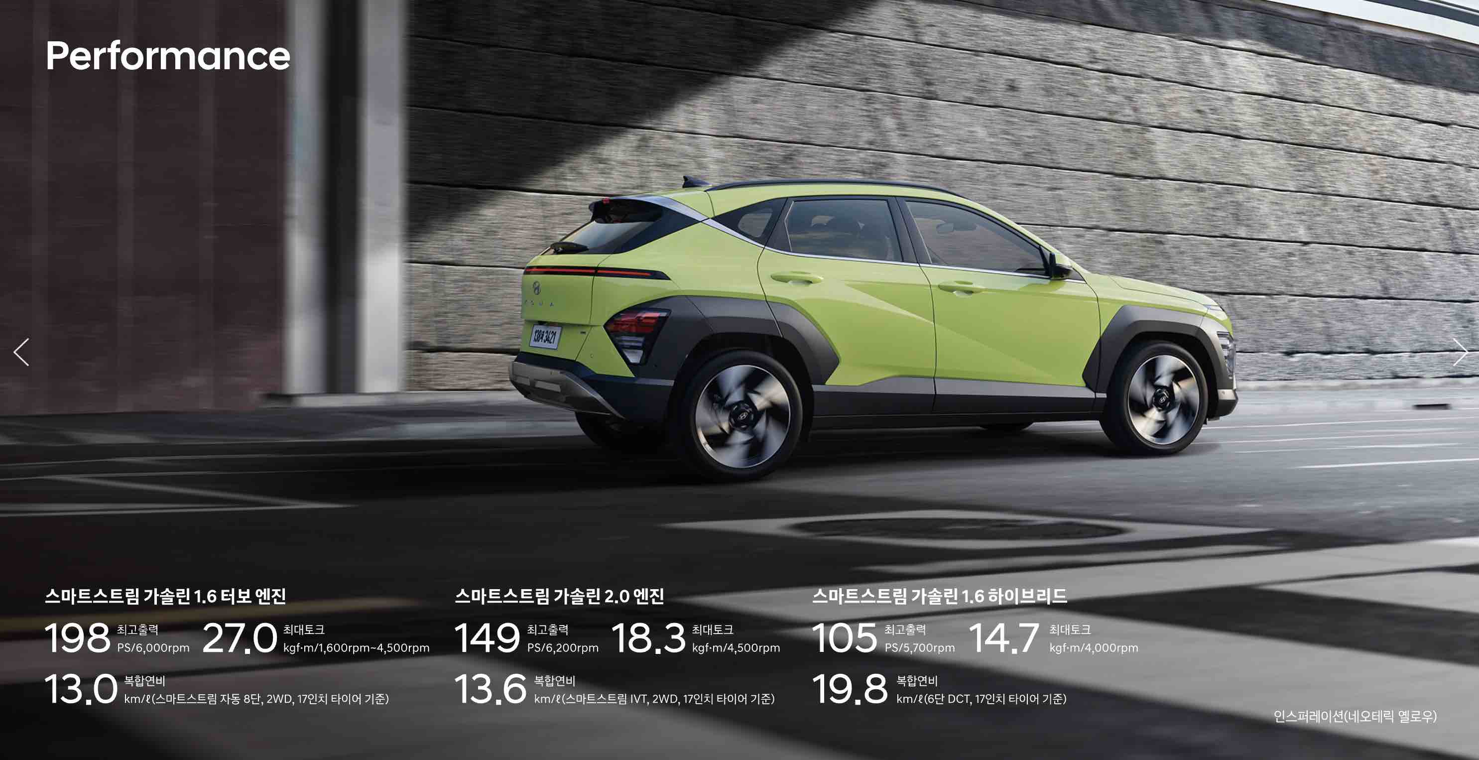 유류비 - 2023년 3월 기준 전국 평균 휘발유 값은 리터당 1570원 기준은 1년에 2만 km 주행한다는 조건으로 계산해 보겠습니다. 코나 1.6 가솔린 터보와 2.0 가솔린의 17인치 차량 조건으로 우선 공인복합연비가 리터당 13km인 1.6 가솔린 터보 1년에 2만 km 주행한다고 가정했을 때 241만 원 정도가 나옵니다. 12개월로 나누면 한 달에 약 20만 원 나옵니다 2.0 가솔린 자연흡기는 공인복합 연비가 13.6km이므로 계산해 보면 유류비는 1년에 230만 원 정도입니다. 즉 한 달에 192,000원 정도가 나올 것으로 예상됩니다. 마지막으로 현대차가 19.8km 리터를 갈 수 있다는 하이브리드 계산해 보니까 1년에 158만 원 정도가 나오고 이걸 12개월로 나누면 한 달에 132,000원 나옵니다. 환경부 인증에 따라서 뭐 복합연비가 어떻게 나올지는 모르겠지만 구형 코나의 경우에도 하이브리드의 연비가 압도적으로 잘 나오긴 했습니다. 말 많은 1.6 터보 하이브리드의 오일 증가 이슈로부터 더 자유로워서 아무래도 신형 코나 하이브리드는 유류비에 민감한 분들이 혹할만할 것 같습니다.